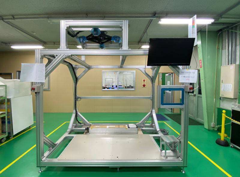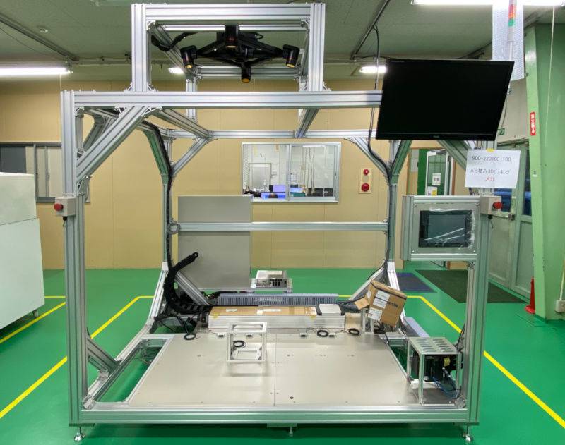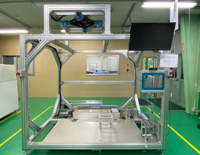 天井の3Dカメラ、モニタ、タッチパネル取付枠、非常停止スイッチ、シグナルタワーなどが取り付けられ装置らしい外観になってきました。モニタはメカ設計でCAD作業に使用していたものを拝借したため27インチと大きめ。なかなかの存 […]